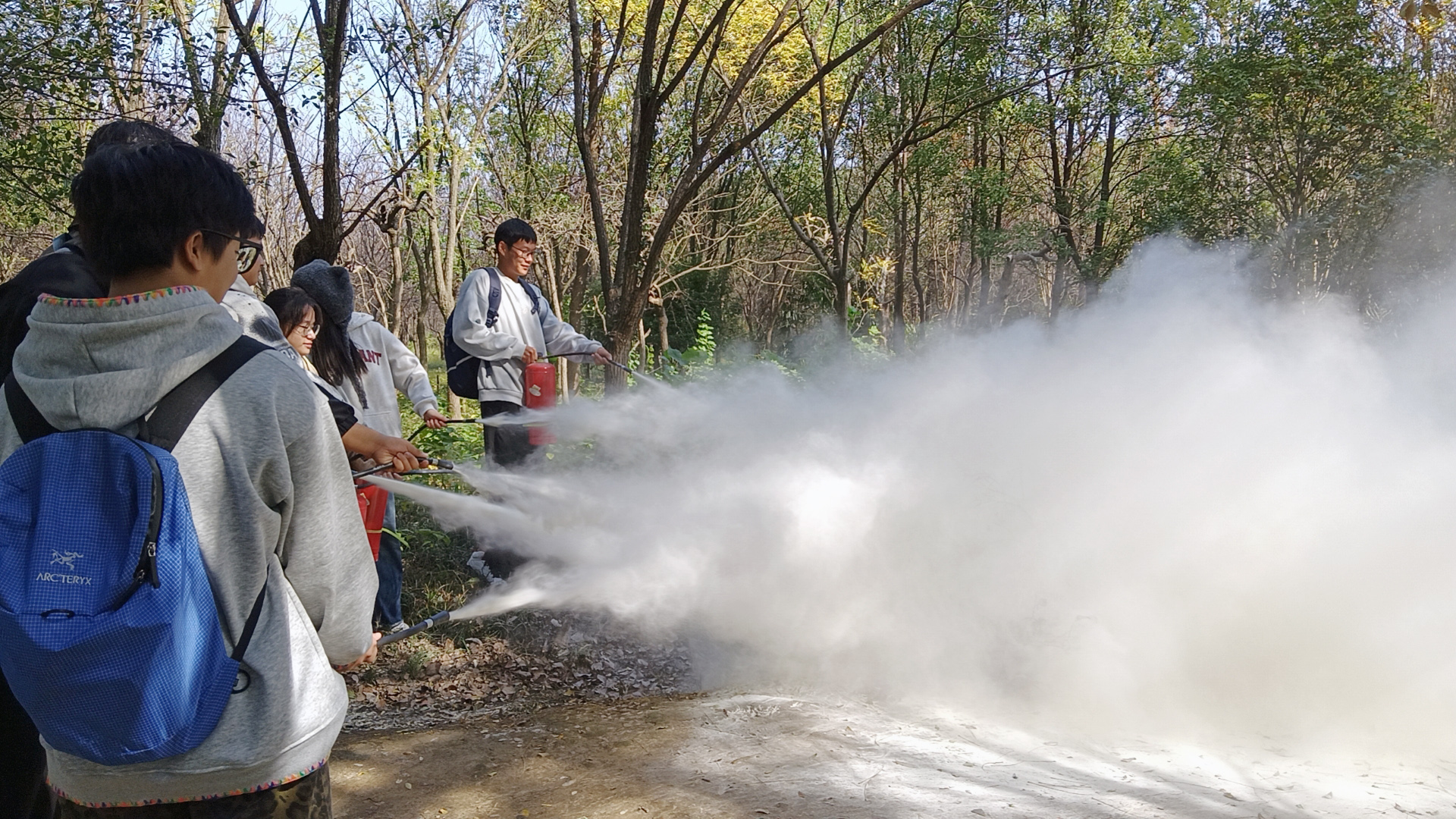 在演练环节,工作人员现场释放烟雾弹,楼里火灾报警系统启动声光报警,师生们在安全管理处工作人员的指导下,全部有序安全逃离火灾现场,疏散到户外安全地带。面对燃烧起来的“熊熊大火”,同学们迅速拿起灭火器,朝火焰根部扫射,使用消防栓将火彻底扑灭。